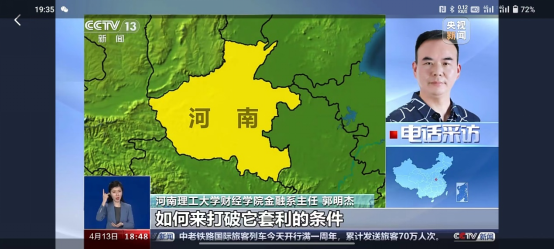 4月13日,央视新闻频道《共同关注》栏目播出了“多家金宝贝闭店 职业闭店人帮‘金蝉脱壳’?”,对近期频发的“背债人”“职业闭店人”现象进行了跟踪报道,期间电话采访了新葡官网金融系主任郭明杰,就事件本质做了专业解读。节目在央视新闻频道播出后,中国之声、央广网、新闻纵横等多个媒体连续报道,引发热烈反响。