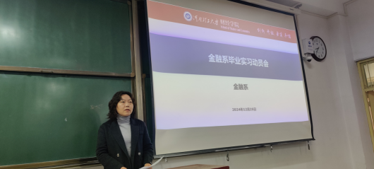为强化学生毕业实习管理,切实提升学生实践能力,确保毕业实习任务顺利完成。12月25日上午,金融系在学院楼1211教室组织召开了2021级毕业实习动员会。此次会议由金融系党支部书记吕淑丽教授主持,金融系主任郭明杰及冯莉、周晓博、翁飞龙、曾力、任建武等老师以及学生参加了此次动员会。
