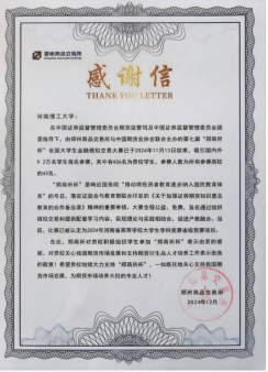 为积极响应国务院“将投资者教育逐步纳入国民教育体系”的号召,我校436名学生参加了郑州商品交易所与中国期货业协会联合主办的第七届“郑商所杯”全国大学生金融模拟交易大赛我校参赛人数位居所有参赛高校的第43名,获得了大赛主办方颁发的优秀组织奖。4月17日晚,校园奖颁奖典礼经管楼1202教室成功举行。