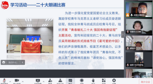 结业仪式在全体人员齐声歌唱的团歌中正式拉开帷幕,主持人首先介绍了本期青马班活动及学习情况,第二期青年马克思主义培训坚持理论与实践相结合的原则分为线上和线下两部分。线上以学习强国青年和政治理论为主要培训内容,线下则以知识理论宣讲和团日活动等为主要培训内容,开展了观影《长津湖》、二十大朗诵比赛等一系列贴合学院特色的活动,形式灵活多样。接着主持人详细说明了“青马工程”管理机制和考核办法,对“青马工程”学员的综合考评采取定量与定性相结合、自我评价与他人评价相结合的方式进行考核。最后,主持人总结第二期青马班工程结业情况,本次结业仪式圆满结束,青马班全体学员线上合影留念。