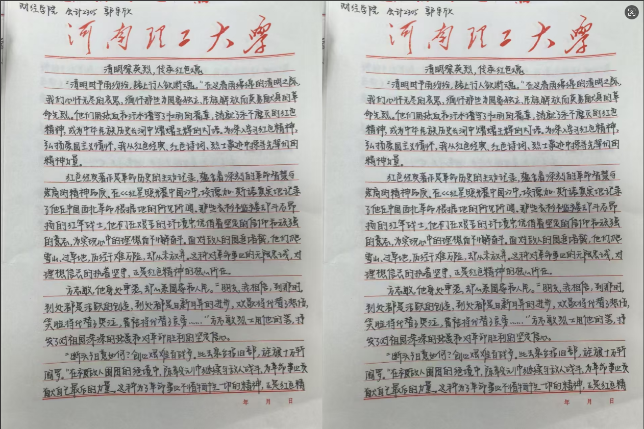 本次活动以“清明祭英烈,传承红色魂”为主题,用笔墨摘抄回溯革命历史,感悟先烈们舍身为国、无私奉献的红色精神。活动过程中,学员们摘抄《红岩》《红星照耀中国》等经典红色读物的精彩篇章或誊写《就义诗》等慷慨诗作,品味文字中的红色基因,感悟笔墨间的爱国精神。其中,谭晶和郭宇欣等学员的摘抄不仅书写工整,观点表述清晰,而且通过系统梳理革命烈士的英雄事迹,深刻诠释了爱国主义的时代内涵。