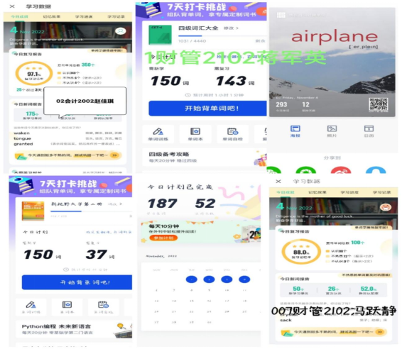 本次活动采用线上打卡的方式,同学们借助英语学习APP或纸质化的形式进行单词学习。活动一经推出,同学们踊跃报名,最终有362人参加此次打卡活动。活动进行期间,同学们坚持每天学习新单词,不断更新自己的学习计划,在单词世界里探索新的乐趣,并在打卡群上传学习记录。活动举办以来,大部分同学坚持每天打卡。坚持英语打卡不仅提高了词汇储备,还在潜移默化中加强了同学们对英语学习的热爱。经最终统计,本次活动共有231名同学成功打卡十四天。单词打卡活动在大家的共同努力下圆满落幕。