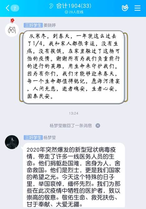为表达全国各族人民对抗击新冠肺炎疫情斗争牺牲烈士和逝世同胞的深切哀悼,2019级会计本专业三个班团支部于4月4日分别举办了主题为“致敬——2020清明祭英烈”的线上主题团日活动,活动由各班团支书主持开展。