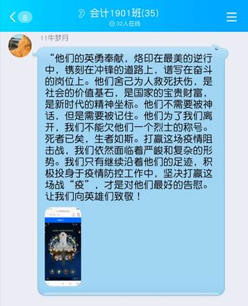 会计1904班团支部组织全班同学在4月4日10:00进行就地就便形式的三分钟哀悼活动,接着便进入了网上祭奠活动,通过网上祭拜、鲜花、留言和浏览革命先烈的英雄事迹,同学们对于先烈的英勇无畏,对于他们的舍小家为大家的种种令人敬仰的品质和行为感慨万千,纷纷在QQ群里发表了各自的感想,这是一种共情,这更是属于国人应有的自豪感,我们应该为此骄傲。