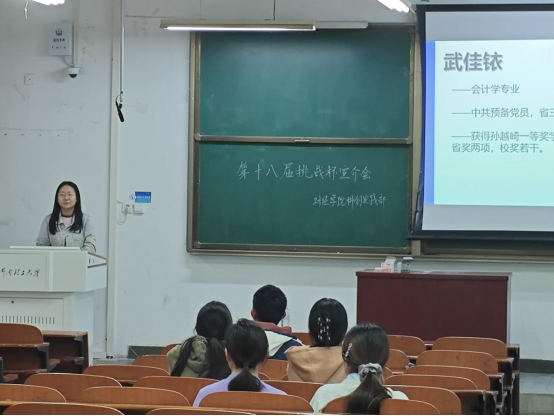 会议主要分为赛事介绍,比赛讲解与互动问答三部分。会议开始,主持人对“挑战杯”赛事的比赛性质,比赛宗旨以及竞赛的方式进行了详细的介绍。随后,由会计专业的武佳铱对“挑战杯”比赛进行了相关的经验分享,她详细地讲解了比赛前的资料查询与课题研究等准备工作。最后,武佳铱对同学们提出的问题进行了细致地回答,并鼓励同学们积极参加比赛创造出更好的成绩。