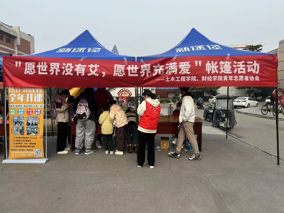 第三十七个世界艾滋病日即将到来,为加强同学们对艾滋病的认识与了解,鼓励其以关爱、尊重的心态对待艾滋病患者,11月23日至24日,财经同土木青协于学苑餐厅小广场联合举办以“愿世界没有艾,愿世界充满爱”为主题的公益活动。