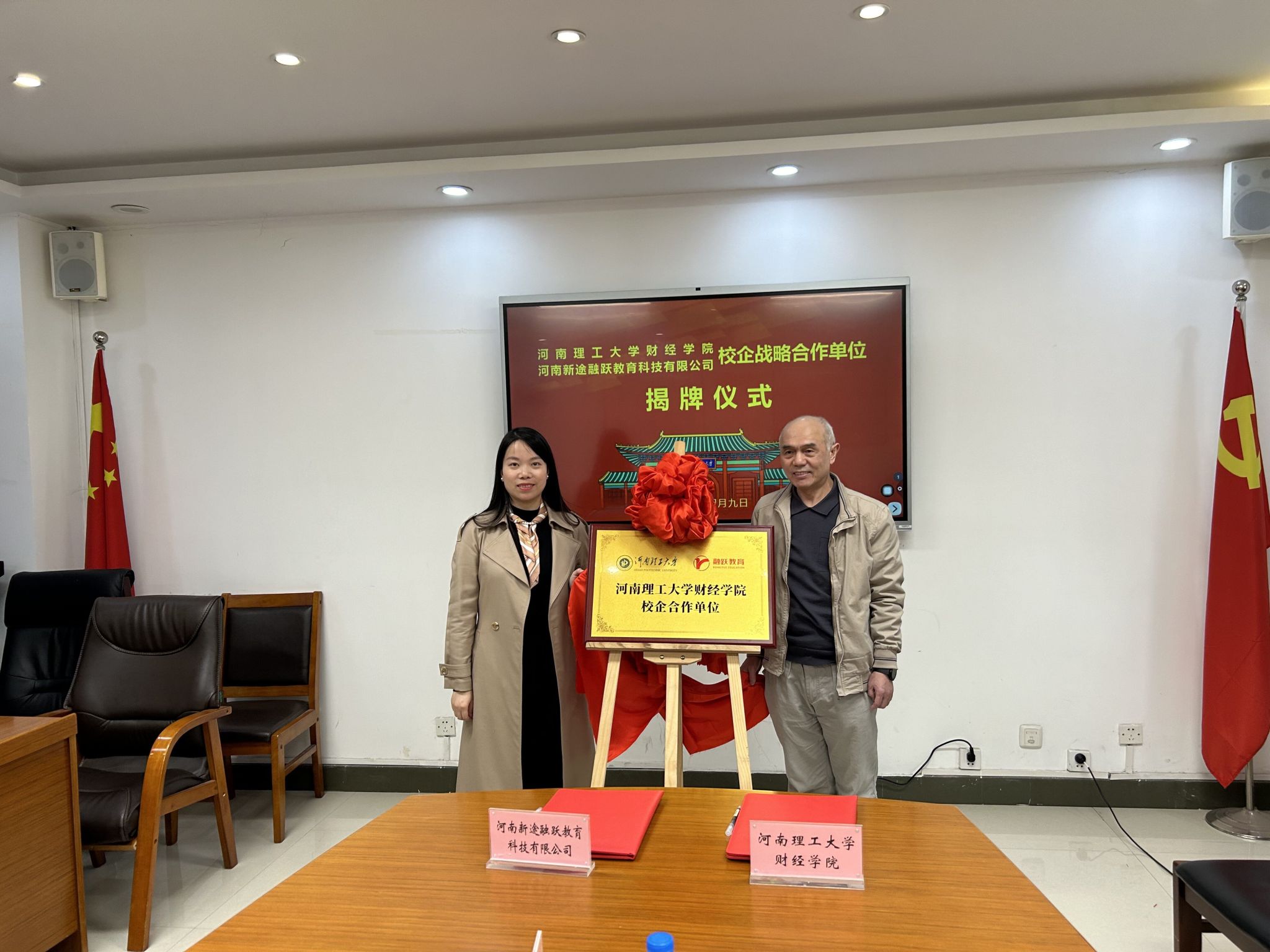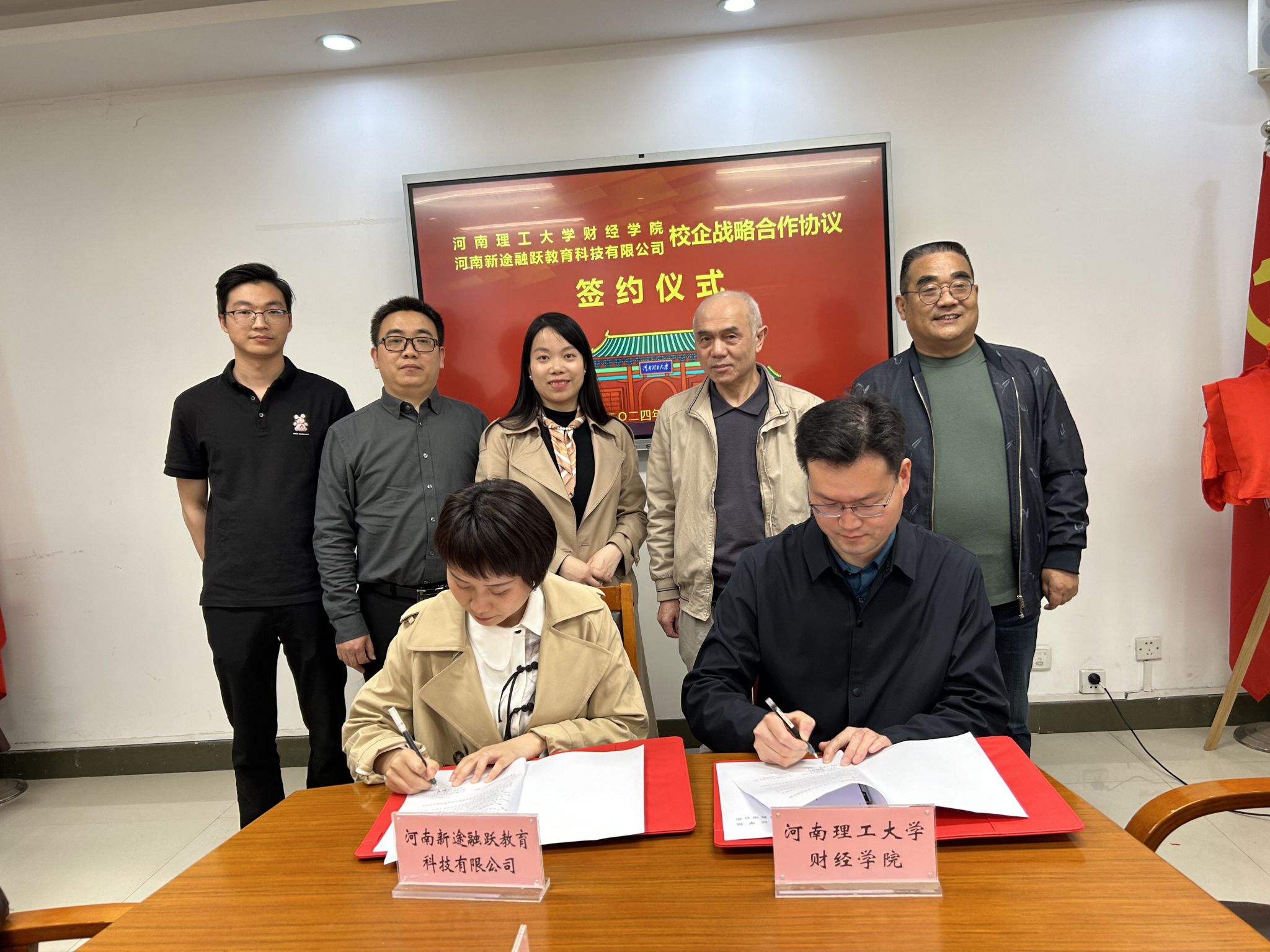 为进一步深化产教融合,拓宽学生实习与就业新渠道,拓展校企协同育人新途径,构建高质量人才培养体系,4月9日下午,3003新葡官方网站与河南新途融跃教育科技有限公司校企战略合作协议签约仪式暨校企合作单位揭牌仪式在经管楼2102会议室举行。学院院长刘霞辉,副院长张圣利,实验中心主任石勇,河南新途融跃教育科技有限公司副总裁杨俊鑫,河南分公司总经理洪颖慧,河南分公司副总经理陈林,校区主管张博、杨阿倩等参加仪式,仪式由副院长张圣利主持。