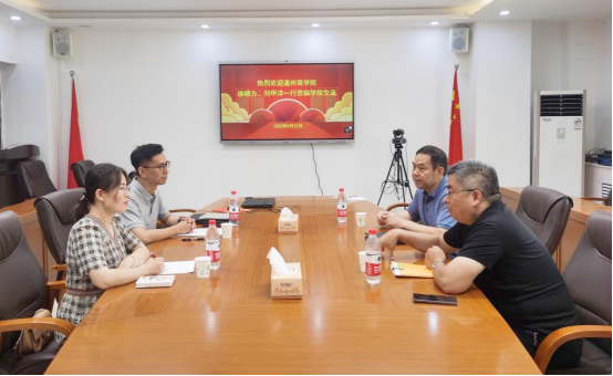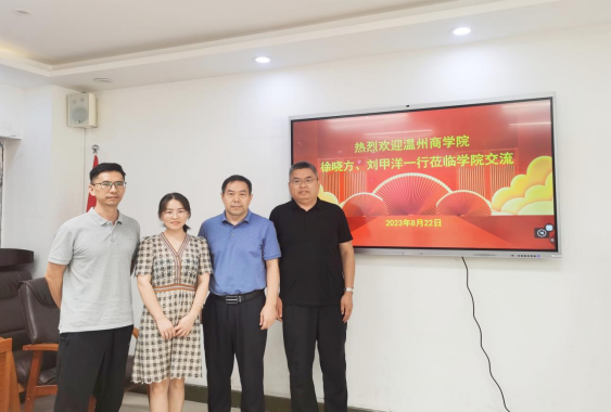 8月22日上午,温州商学院智能会计产业学院常务副院长(2003级财务管理)刘甲洋、副院长徐晓方一行莅临母校交流考察。学院副院长任长江、会计系主任王玉法出席座谈会并陪同参观了学院实验中心、系室办公室等场所。