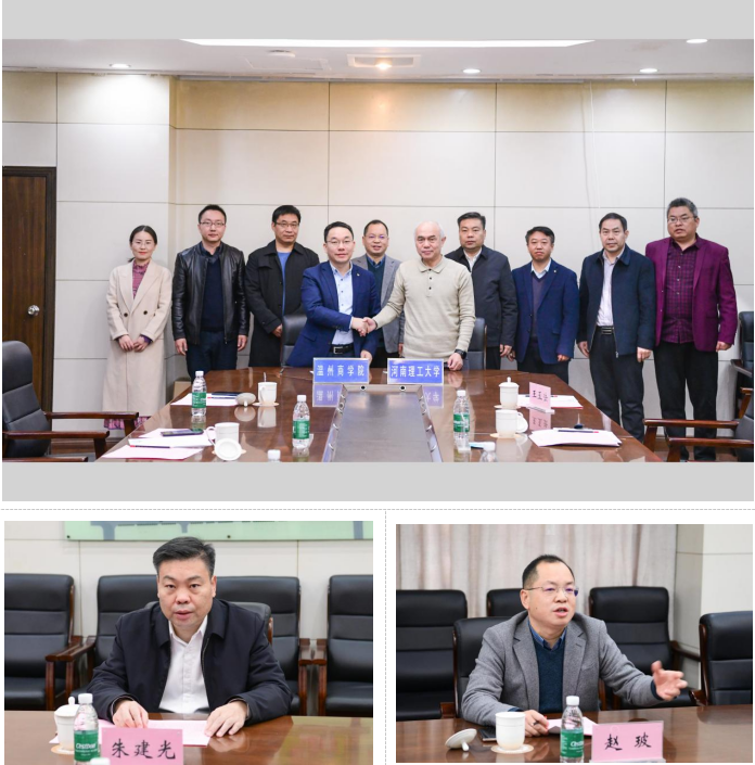 赵玻对河南理工大学百忙之中的热情接待表示感谢。他首先介绍了温州商学院的基本情况,详细阐述了温州商学院立足民营经济先行地所形成的创业教育特色和国际教育特色,并就学科建设和硕士学位授予单位创建做了介绍。他指出,温州商学院是浙江省确定的硕士学位授予立项建设单位(2022-2026),学校高度重视学科建设和硕士学位授予单位创建工作,加强学科特色凝练,培育硕士学位授权点,加大学校内涵建设,制定联合培养硕士研究生规章制度,保障联合培养研究生的培养质量。他强调,通过与河南理工大学签订联合培养硕士研究生协议,可以对温州商学院硕士学位授予单位创建及学科专业发展、人才培养质量提升产生较大促进作用,也希望双方能以此为契机,共享资源,优势互补,培养出更多优秀的高层次人才。