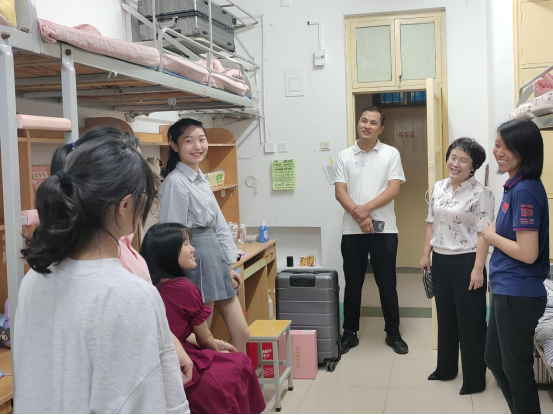 “家乡是哪里的?”“学校伙食能不能适应啊?”“对住宿条件还满意吗?”“有没有遇到什么困难啊?”领导们的亲切问候迅速拉近了师生之间的距离,同学们也纷纷回应领导关切。面对新生提出的各类问题,领导们耐心细致地解答,积极努力地解决,让刚进校园的同学们感受到家一般的温暖。在为同学们争取更好生活环境的同时,领导们也提出了对新生的期待,希望大家能尽快适应大学生活,做好大学规划,学有所成,不辜负家长期望。其次还嘱咐同学们要互相关心、互相帮助,注意安全。最后临走前,领导们也不忘提醒学生要谨防诈骗,注意保管好个人财产,叮嘱学生遇到困难和问题可以向班委和辅导员反映,共同解决。