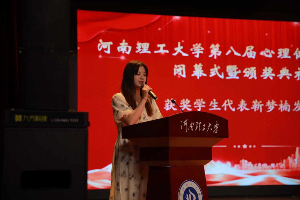 闭幕式在心理情景剧展演和文艺演出中拉开帷幕。获得心理情景剧大赛一等奖的剧目《破茧》演绎了一个在原生家庭中自卑、懦弱、抑郁和被压抑的叛逆学生在辅导员、心理老师的帮助下所发生的蜕变;歌曲《灯火里的中国》气势恢宏,演唱温婉,表达了对祖国的祝福和热爱;街舞串烧展示了青年人的朝气蓬勃和无限热情。接下来,领导嘉宾为获奖集体和个人颁奖。3003新葡官方网站财管2004班靳梦楠作为获奖学生代表发言,讲述参加心理健康文化节活动的收获和成长,呼吁青年大学生用健康乐观的心态,满怀激情、无所畏惧、勇往直前。