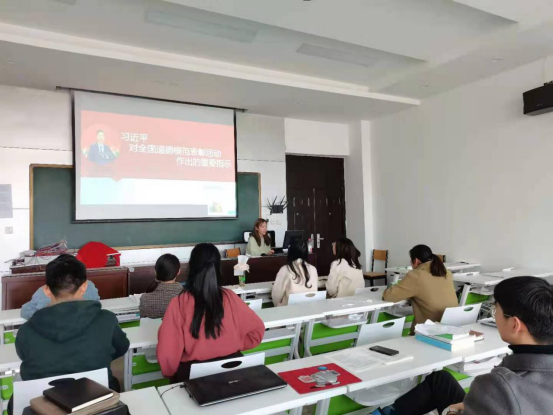 学习内容由两部分组成,第一部分是学习“我们交出了抗疫斗争的优异答卷”相关内容,由陈艳霞同学带领大家共同学习;第二部分是“习近平对全国道德模范表彰活动做出的重要指示”相关内容,由朱玲玲同学做主要讲述。