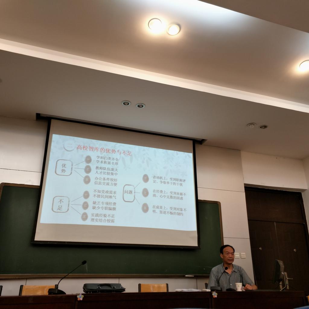 会上,王保庆主要从智库的源头和基础、高校智库的优势与不足、高校智库建设的一般原则、高校智库产品的写作与传播、对高校智库评价体系的探讨、学术探讨转向影响决策、积极开展智库外交和努力提高我校智库影响力和社会知名度等八个方面对智库建设和智库文稿写作相关问题进行了分析。他指出,党的十八大以来,智库问题得到了党中央的高度重视和社会各界的热切关注。智库建设逐步成为中国党政决策科学化、民主化、法制化的重要支撑,成为中国软实力建设的一大支柱,成为中华民族伟大复兴的坚定文化自信和重要思想引领。他认为,高等教育是智库的源头和基础,智库的成立或智库人物的产生,都离不开高层次的教育。他通过对高校和智库的特点对比,分析了高校智库的优势和不足以及发展中存在的问题。他从目标定位、学科设置、工作方法、核心要素、不离教学和思维转型等方面提出了高校智库建设的一般原则,建议我校智库建设应服务于河南省经济社会发展,为河南振兴和中原崛起服务。他指出,研究和撰写智库文稿,在选题上要体现领导关心和社会需要,在政治上要体现立场坚定,为党分忧,为民服务,为国争光;在内容上要体现人无我有,人有我优,思想创新,言简意赅,高人一筹。高校智库应通过与主流媒体合作,举办高端论坛等方式,不断扩大社会影响力。 对高校智库的评价,他提出了基础影响力、决策影响力、社会影响力、学术影响力和国际影响力等方面基本指标。他强调,高校智库文稿是关系国计民生和公共利益,供党政领导决策参考的“新观点、新理念、新政策、新举措”建议稿件和“引导舆论、凝聚共识、促进发展”的理论著述。最后,他提出,要积极开展智库外交。智库外交具有官方外交不一样的效果。他建议我校要坚持不忘初心、砥砺前行、协作创新,不断提高学校智库的决策影响力、社会影响力和学术知名度。