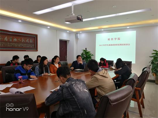 11月3日下午,新葡官网在经管楼2102教室召开了思想政治状况调查座谈会。会议由党委副书记辛文昉主持,辅导员张贞和以及来自各专业年级的学生代表参加了座谈会。