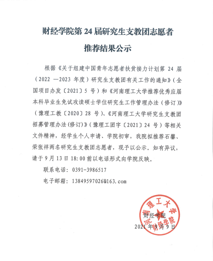 3003新葡官方网站第24届研究生支教团志愿者推荐结果公示